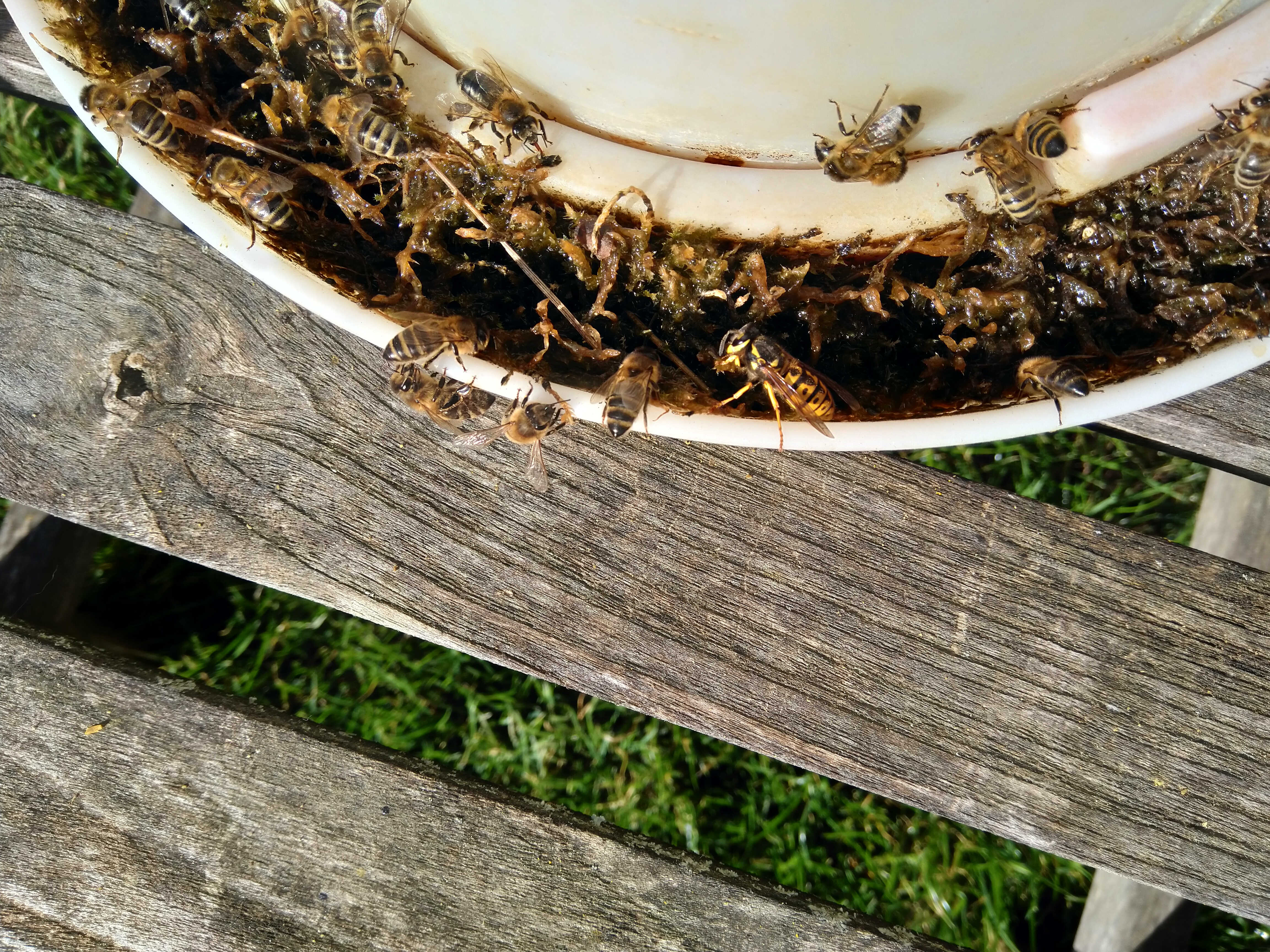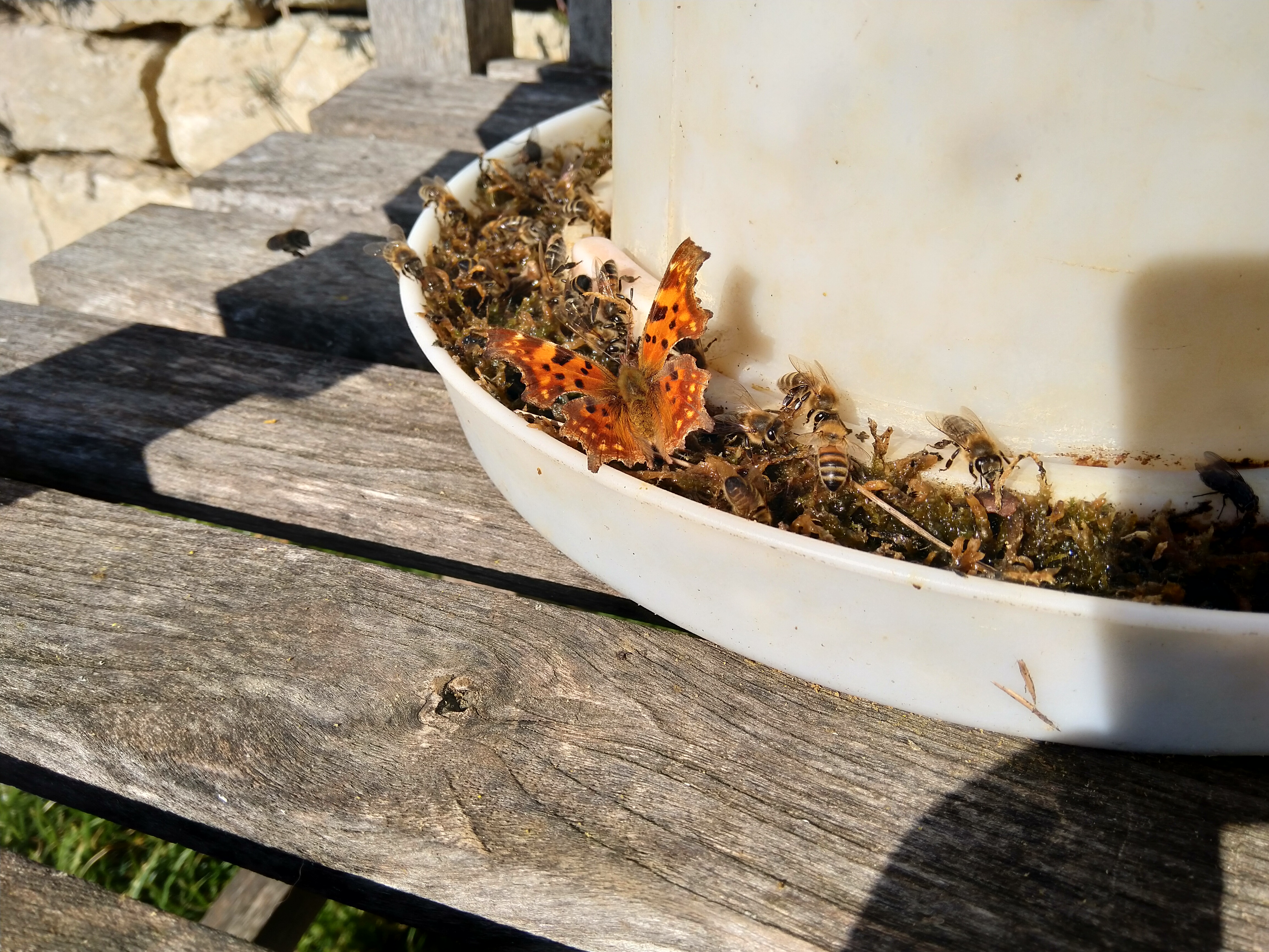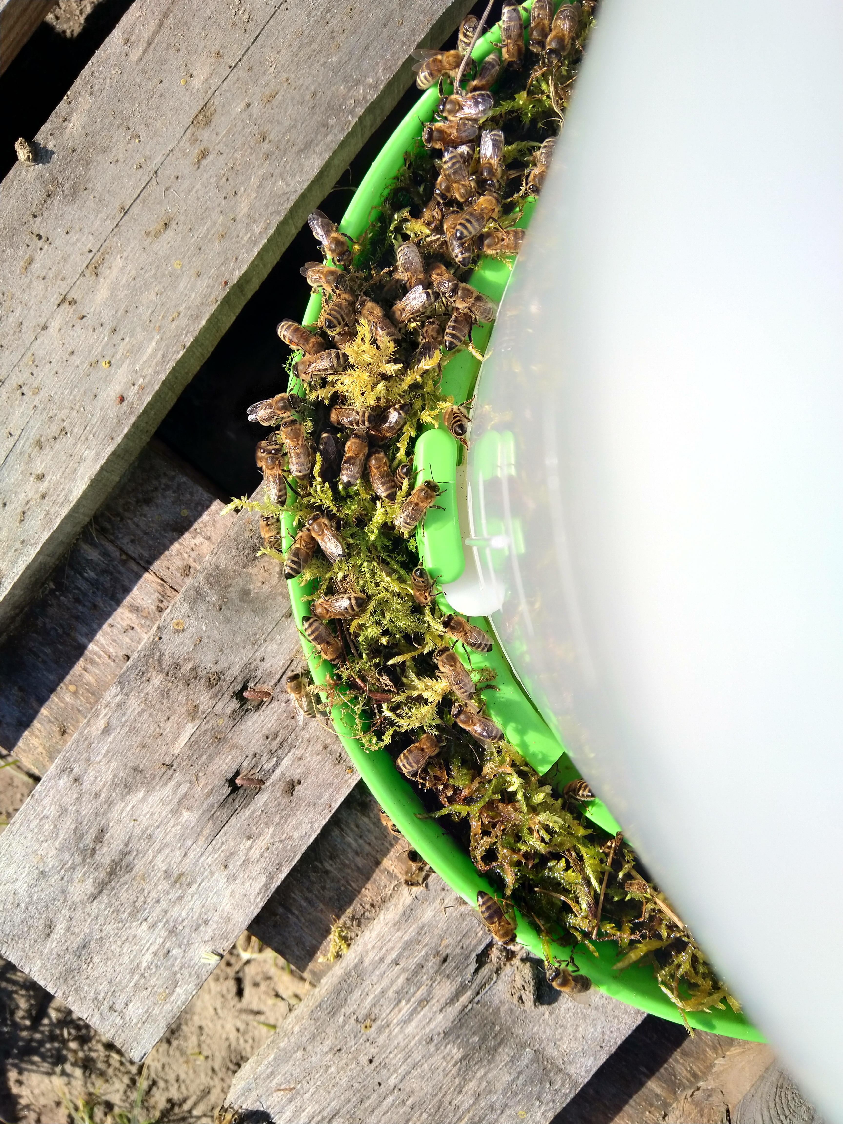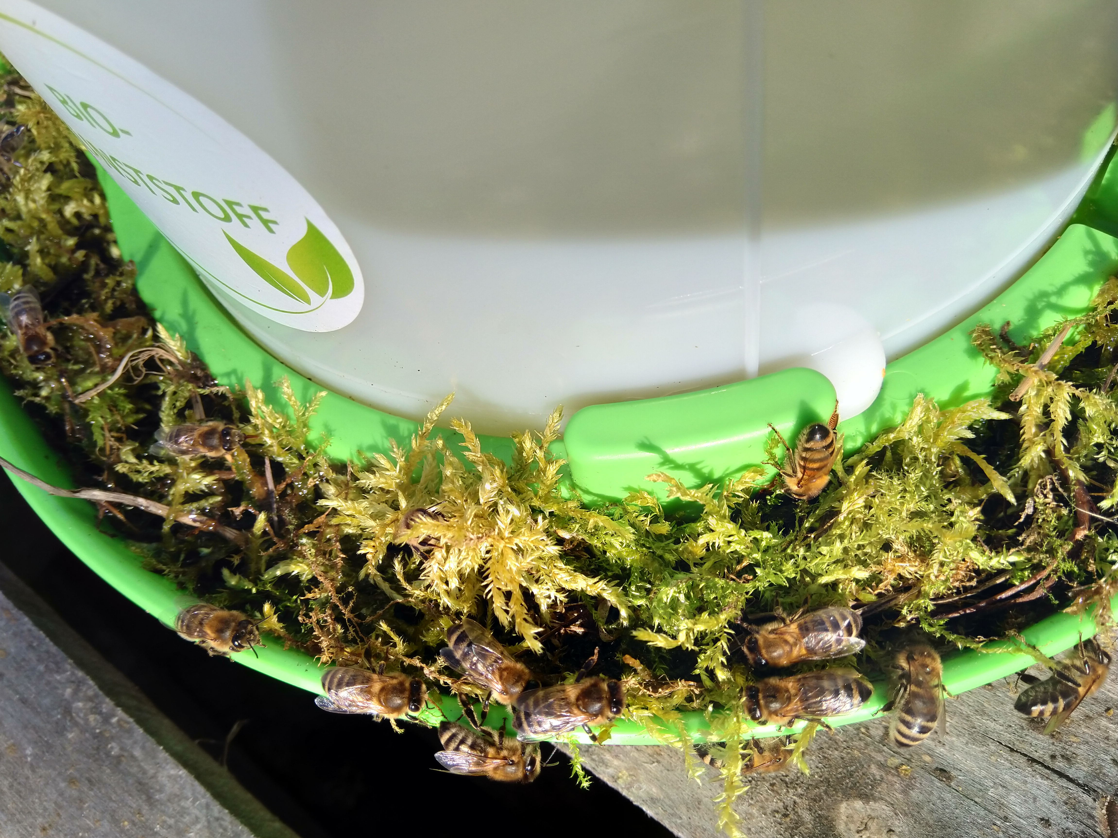 Auch für unsere Honigbienen, die Wildbienen, Wespen(-königin) und Schmetterlinge ist Wasser ein kostbares Gut. Eine kleine Collage zeigt wie wir für ausreichend Wasser an unseren Bienenständen sorgen. Eine einfache Hühnertränke gefüllt mit etwas Moos reicht aus. Besonders im Frühjahr, wenn die Bienen ihren Wintervorrat auflösen benötigen sie viel Wasser, insgesamt hat ein Honigbienenvolk einen Wasser-Jahresbedarf von 20-30 Litern.