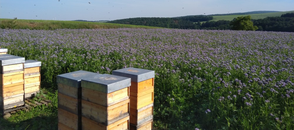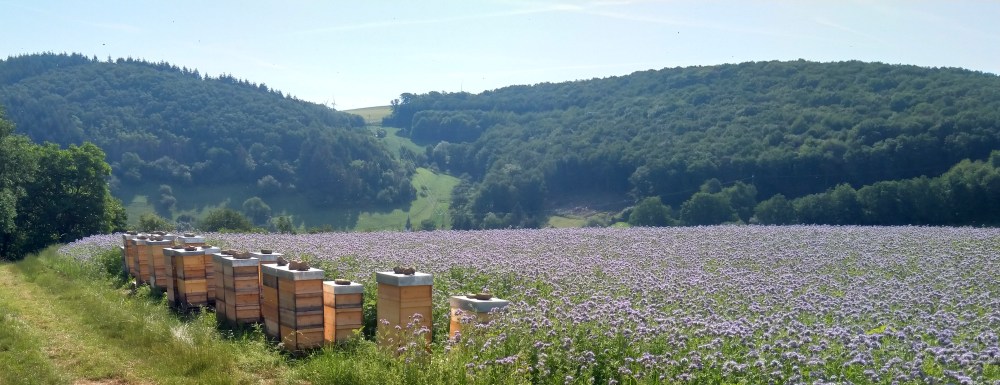 Die Phacelia ist eine ursprünglich aus Amerika stammende Zierpflanze. Sie wird in den letzten Jahren vermehrt in Bienenweidemischungen auf Ausgleichs- und Stillegungsflächen eingesetzt. Diese Flächen werden uns dann dank einer landwirtschaftlichen Kooperation für unsere Bienenvölker zu Verfügung gestellt.