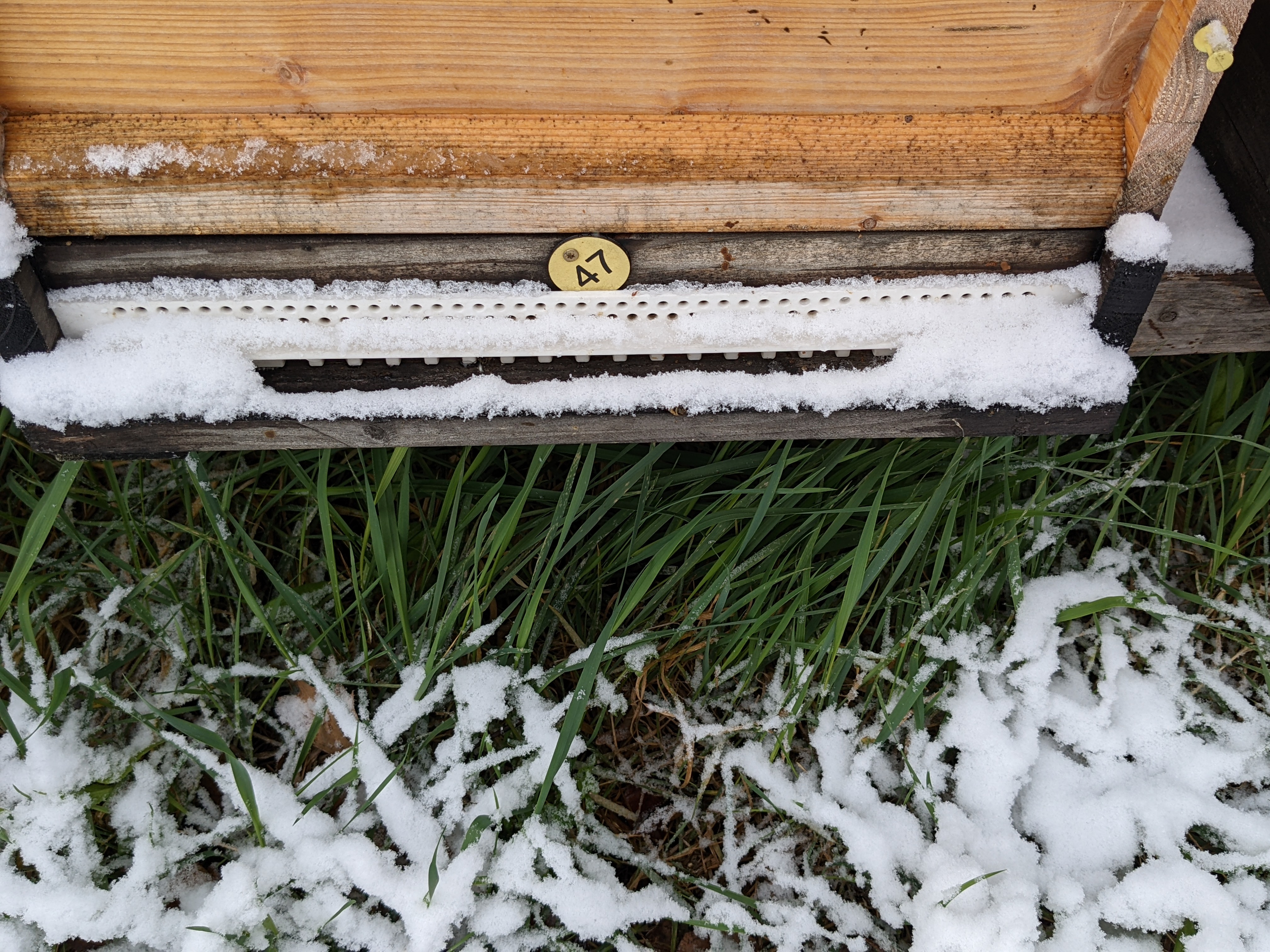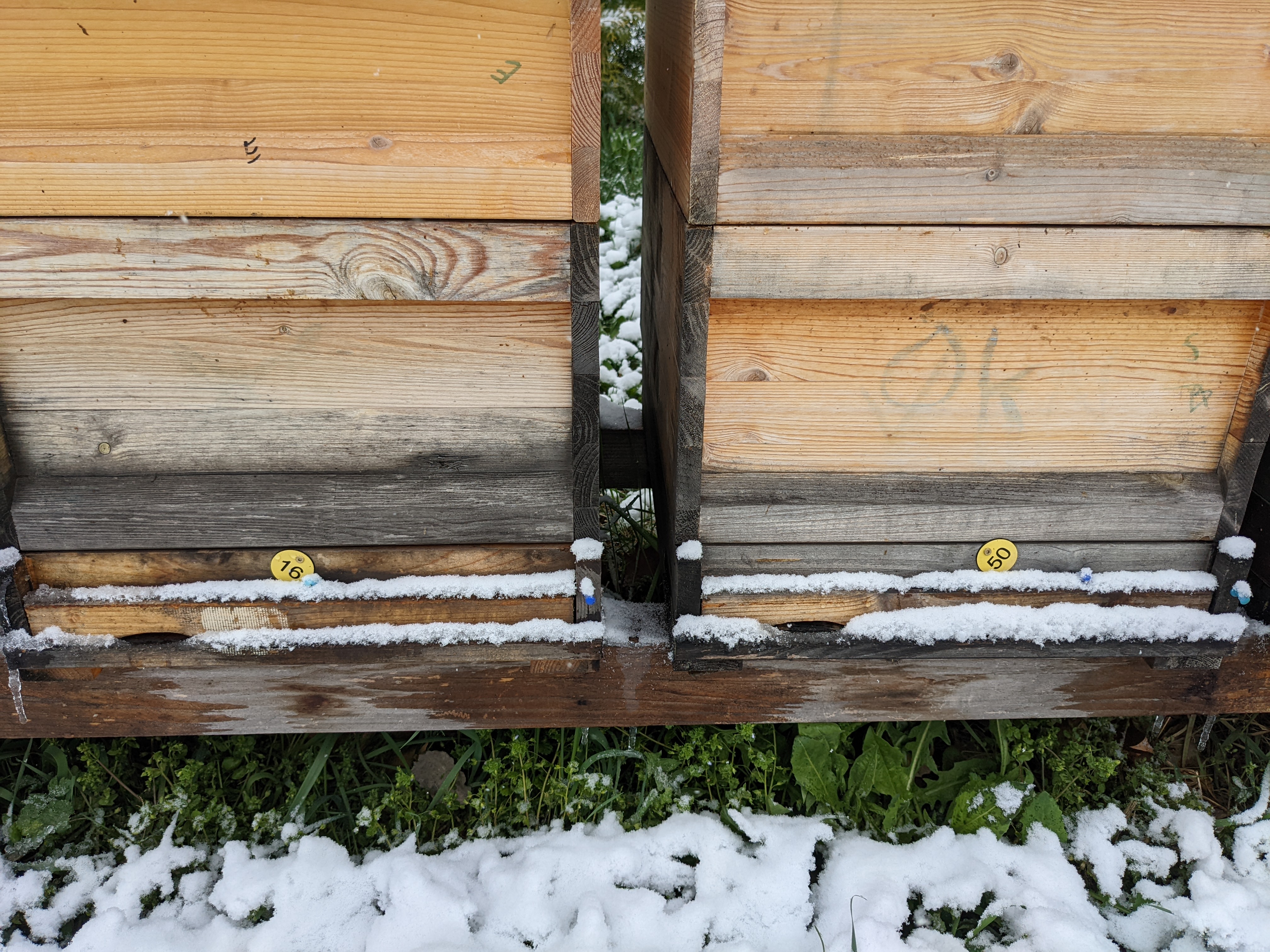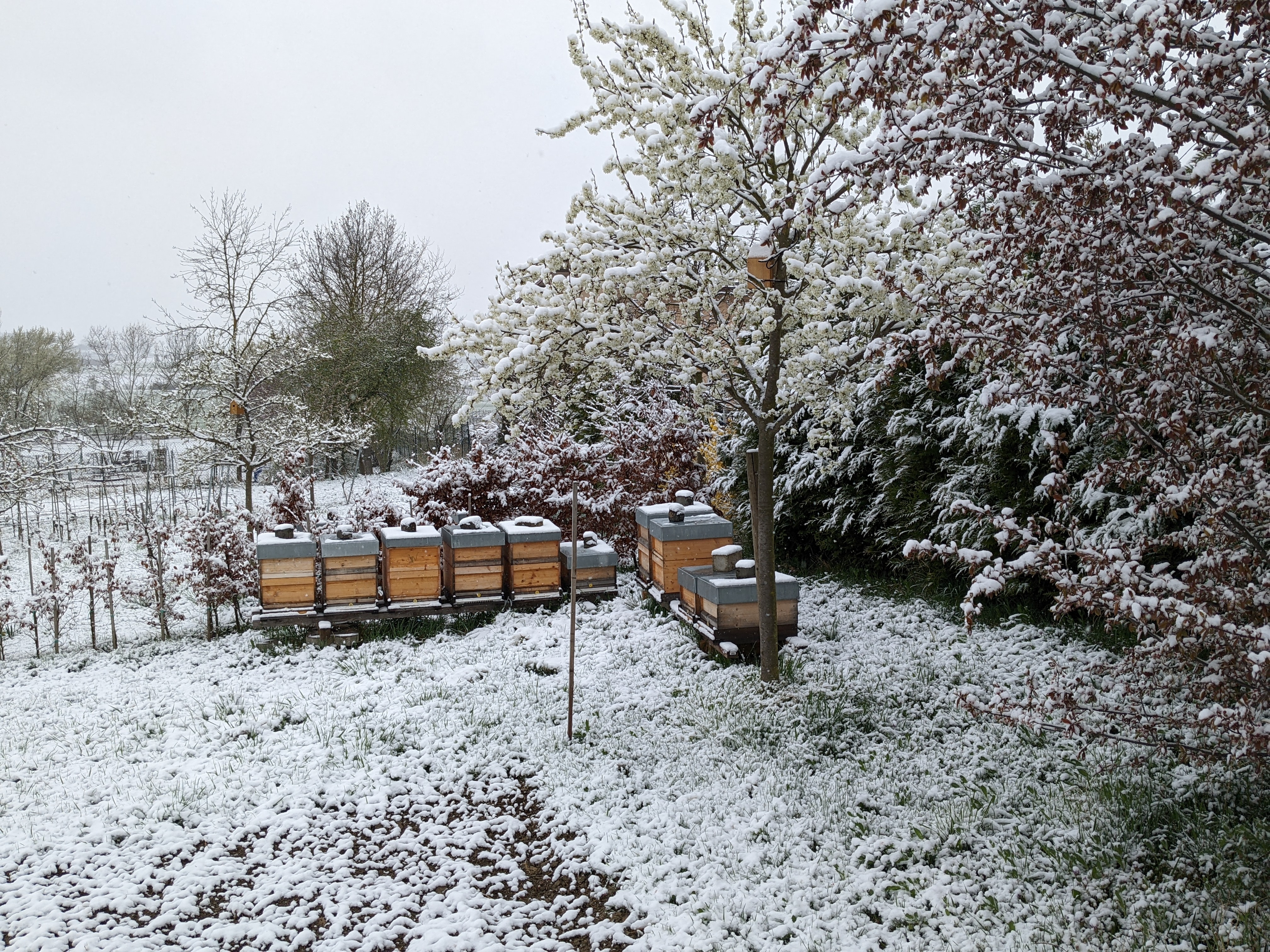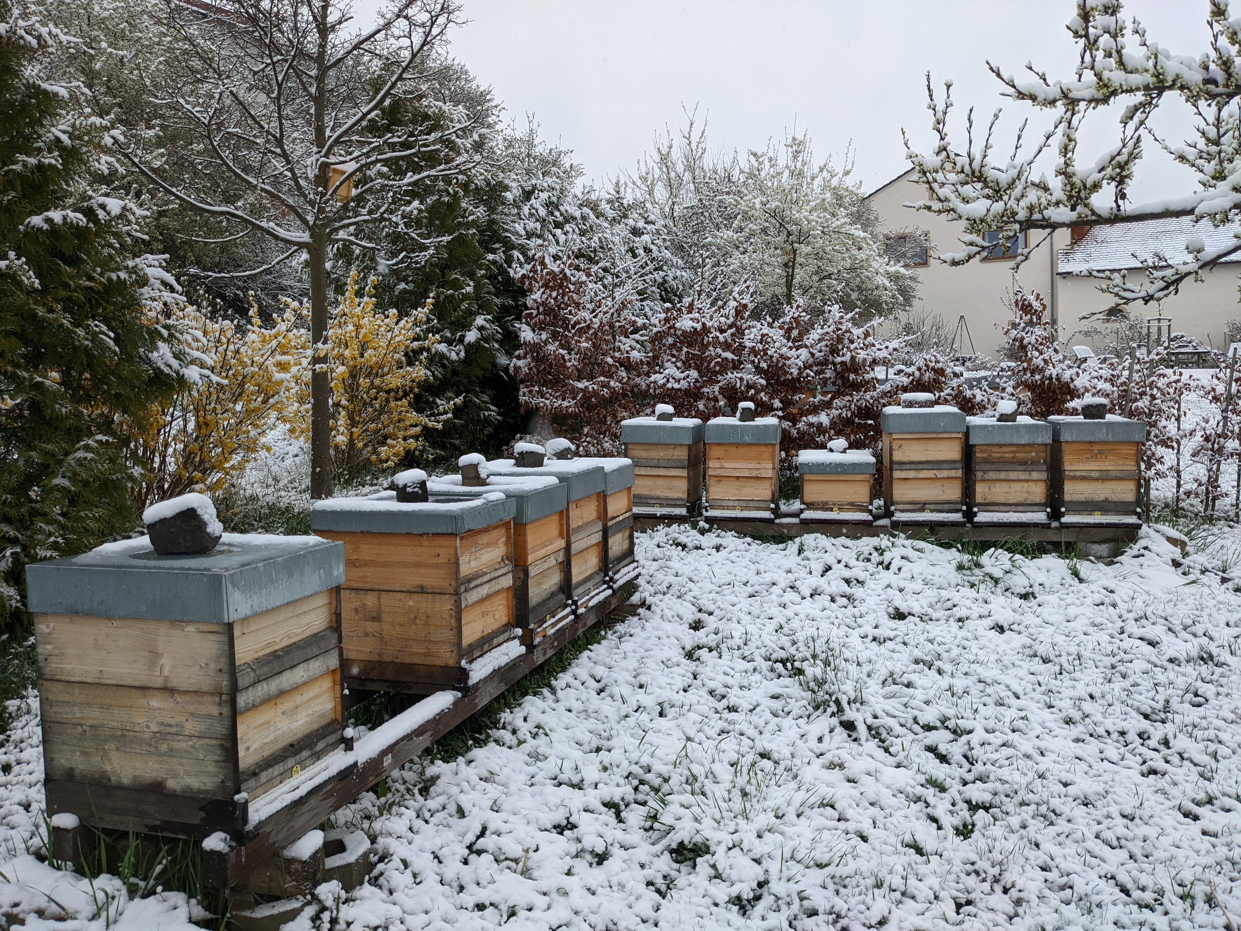 Am Montag noch plus 22°C und Sonne satt, heute -1°C und Schnee. Den Bienen macht das allerdings nichts aus. Solange sie ausreichend Honigvorräte haben, stecken sie solche Kälteeinbrüche locker weg.