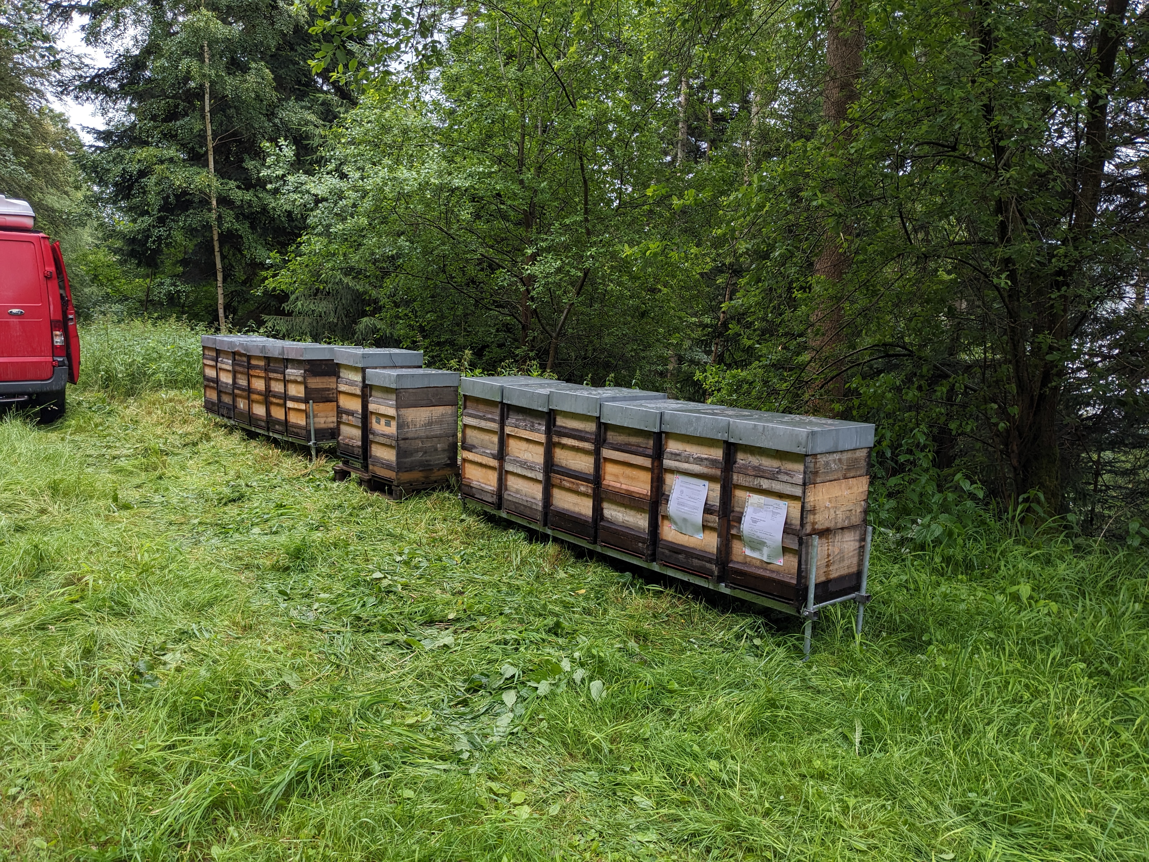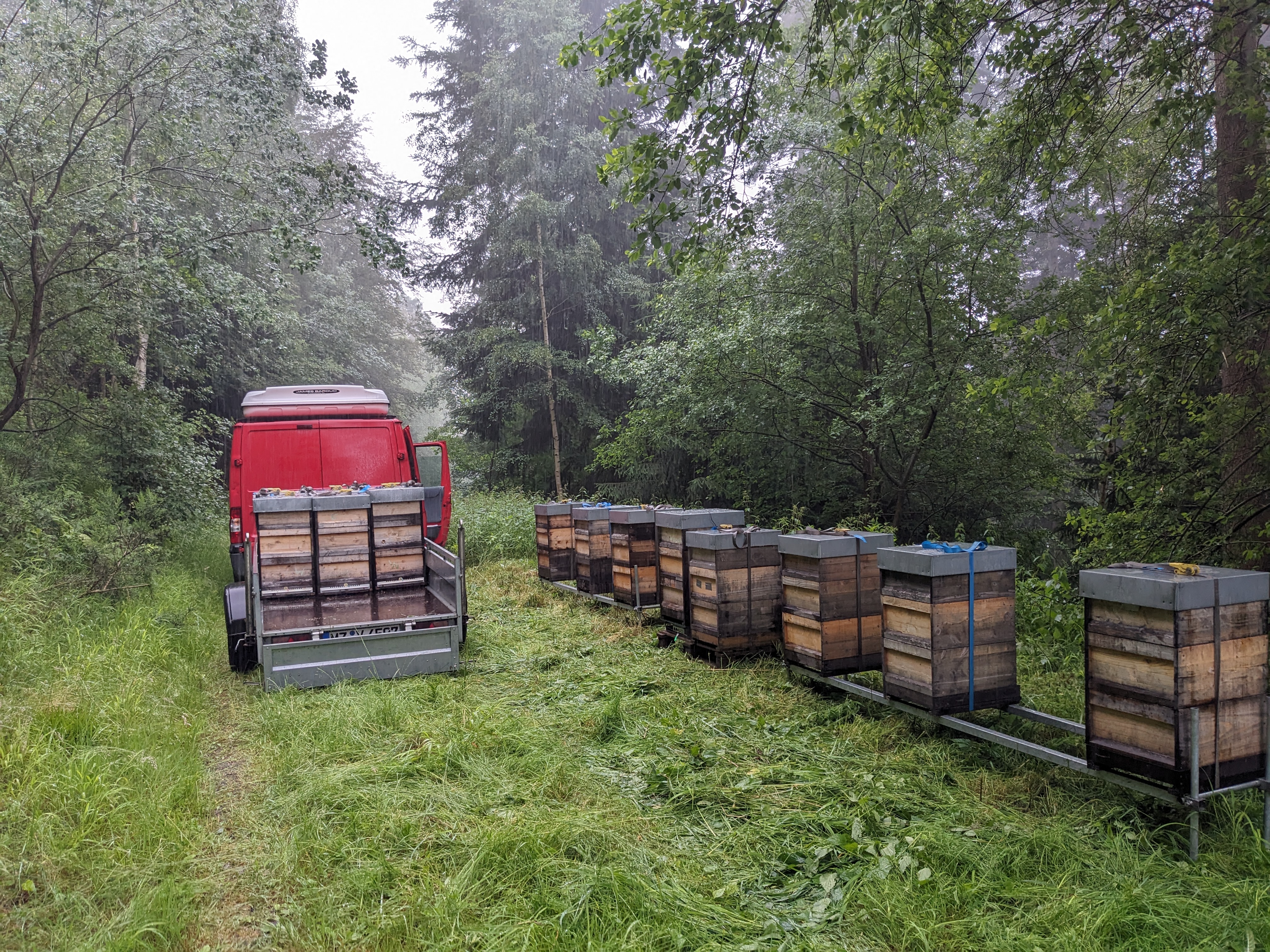 Unter erschwerten Bedingungen sind wir in dieser Woche in den Schwarzwald gewandert. Am Vorabend wurden die Völker verladen, und in den frühen Morgenstunden ging es dann in strömendem Regen Richtung Karlsruhe. Am Standort in der Nähe von Pforzheim angekommen, erfolgte die Standeinrichtung – immer noch im strömenden Regen. Nun hoffen wir auf gutes Wetter und eine ergiebige Waldtracht.